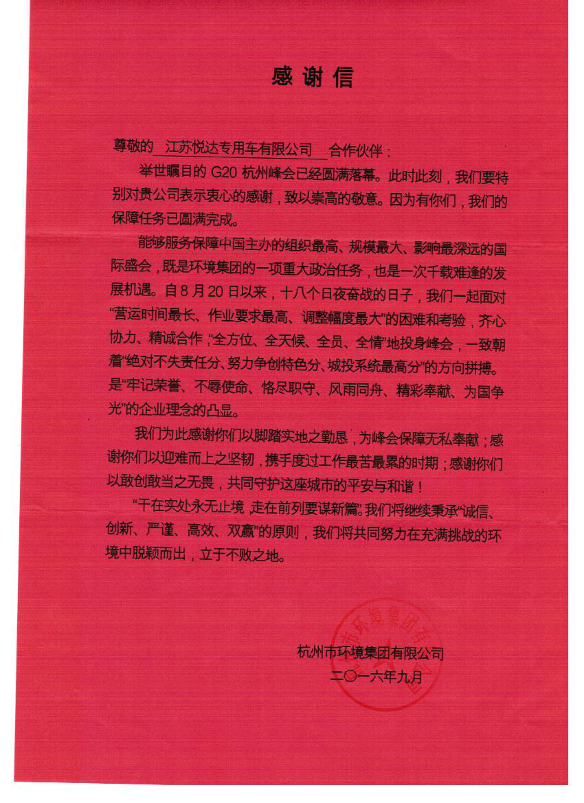 2016年举世瞩目的G20国际经济合作论坛峰会在中国杭州举行,作为组织最高、规模最大、影响最深远的国际盛会,江苏悦达专用车积极配合杭州市环境集团一起完成了这项意义重大的政治任务,加深了悦达和杭州人民之间的情感,获得杭州市环境主管部门的高度认可和赞赏,同年最新产品亮相浙江王牌节目《奔跑吧兄弟》,进一步打开市场品牌宣传效应,为后续宁波市城镇生活废弃物收集循环利用示范项目、杭州环境集团国Ⅵ车辆采购项目打下了良好的基础。